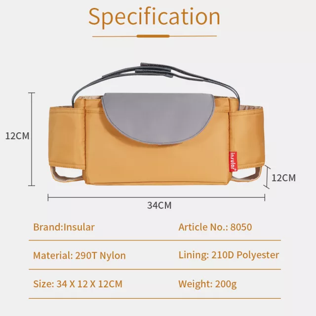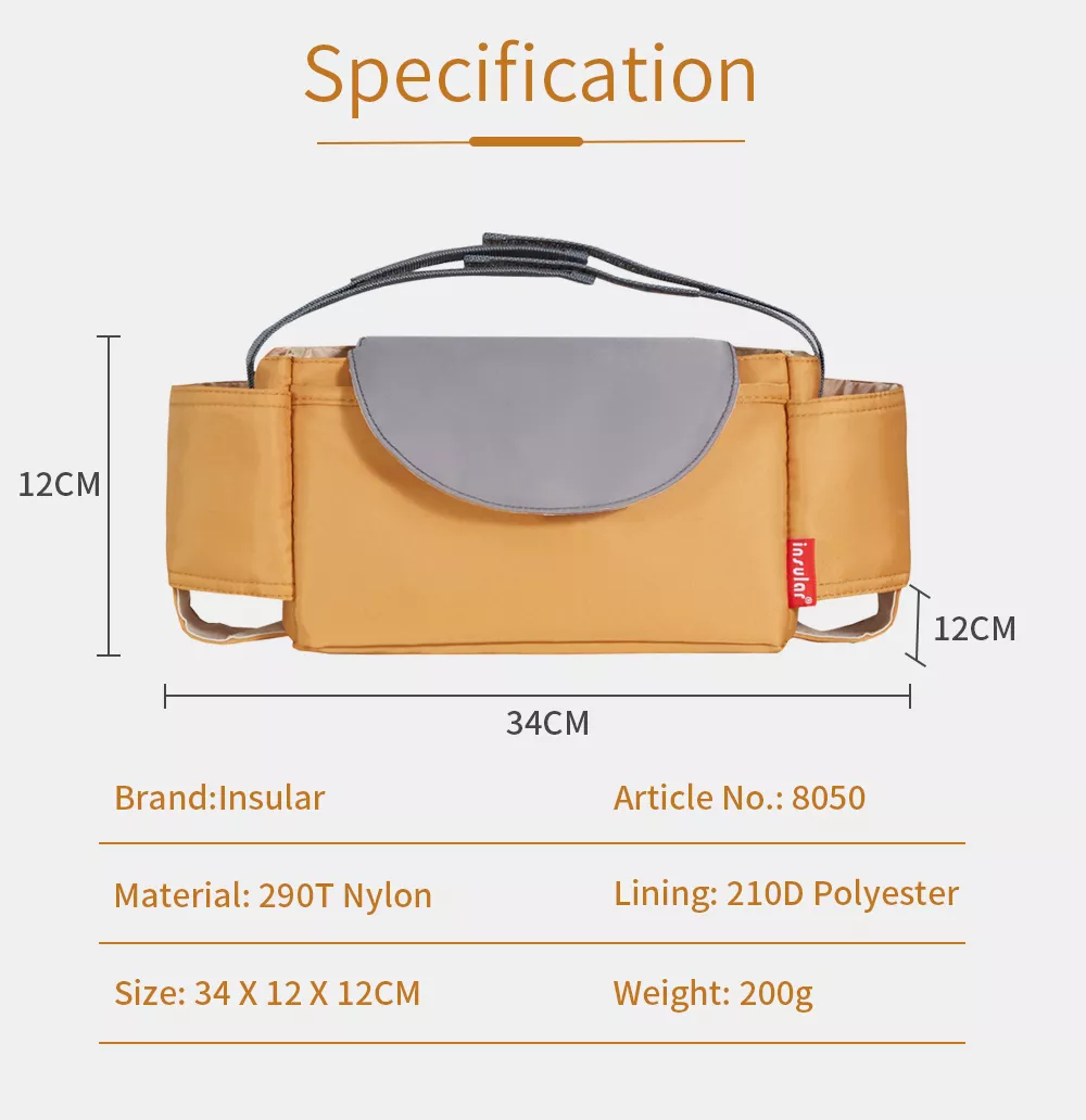 This lightweight yet durable stroller bag features multiple compartments to neatly store everything from baby bottles to snacks, wipes, keys, and your phone. A built-in cup holder keeps drinks upright and easily accessible, while the secure zipper and velcro closures ensure nothing falls out along the way. Made from high-quality synthetic fiber, it’s water-resistant and easy to clean — perfect for everyday use and travel alike.