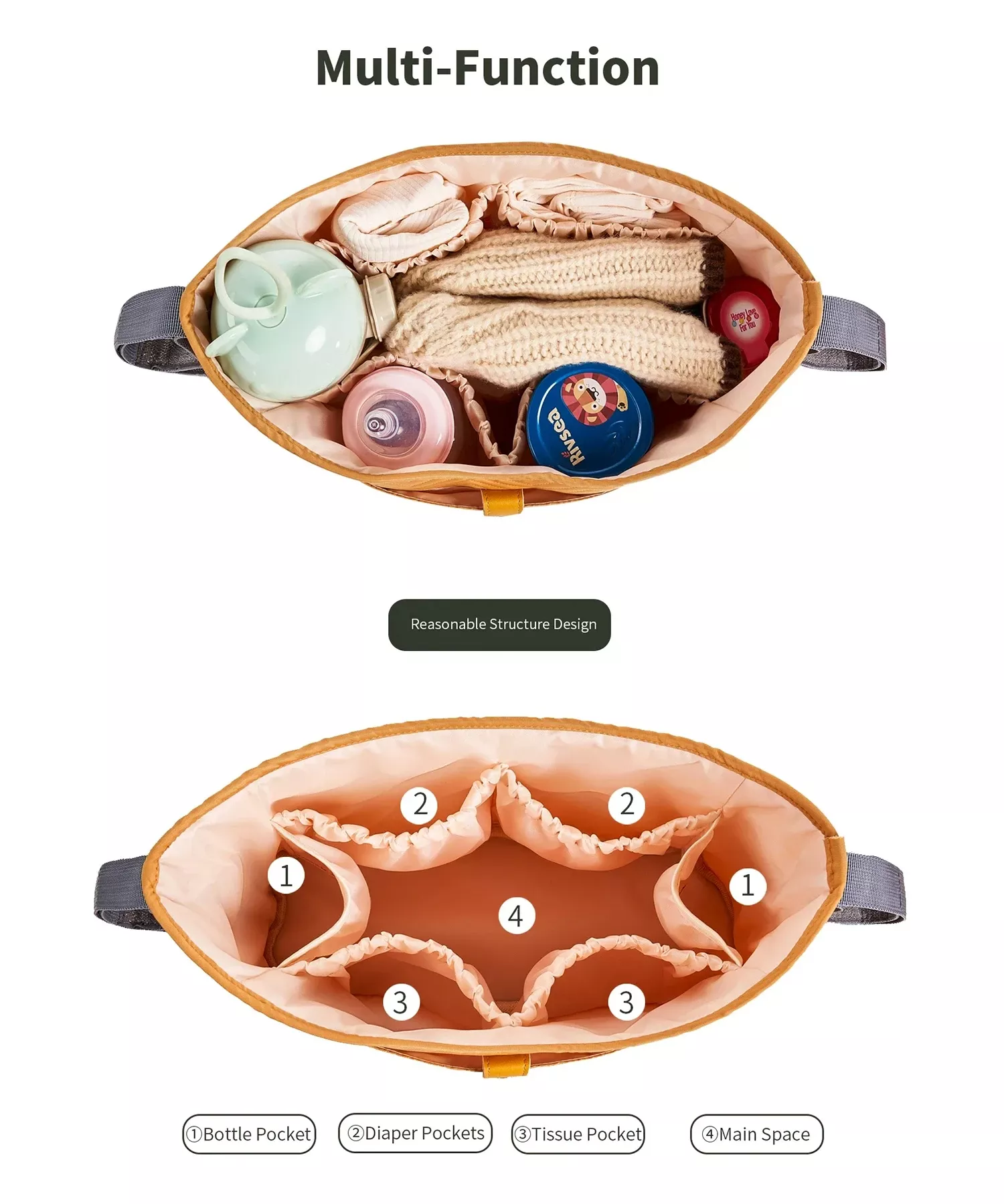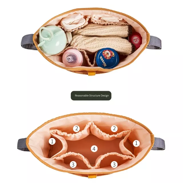 Crafted from durable synthetic fiber, this bag is lightweight, sturdy, and built to withstand daily use. The thoughtful layout includes dedicated compartments for baby bottles, diapers, wipes, and your personal items. With easy-to-attach hooks, it secures firmly to any standard stroller handle, keeping everything you need right at your fingertips.