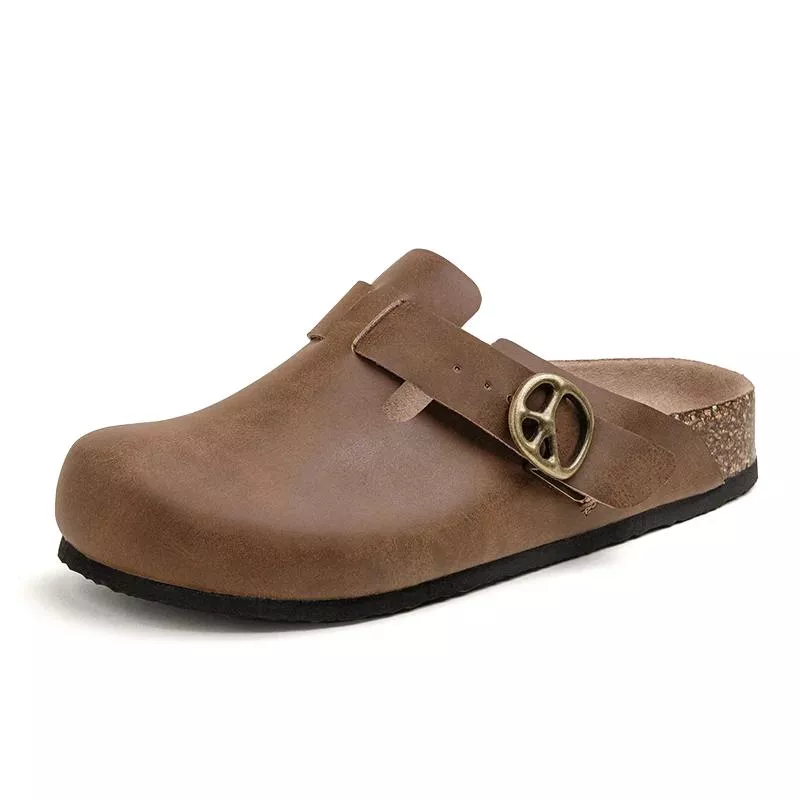 Slip them on and step out with ease thanks to the round-toe design and open heel. The aged leather upper develops a unique patina over time, making each pair truly one-of-a-kind. The antique bronze buckle adds a bold accent while giving you an adjustable fit tailored to your foot shape. Combined with a thick EVA cork sole, these mules are designed for superior comfort and long-lasting support — perfect for all-day wear during spring and summer.