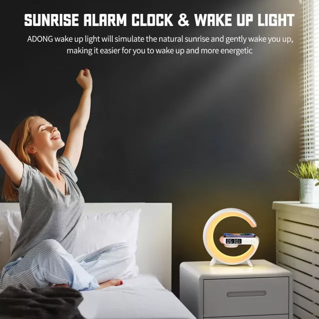 Engineered with 15W fast wireless charging capability, it powers your smartphone efficiently with a Type-C connection for stable performance. Its Bluetooth 5.0 speaker delivers crystal-clear sound while letting you enjoy hands-free calls with the built-in microphone. The dynamic RGB light offers nine color modes, perfect for creating a relaxing atmosphere, energizing your space, or syncing with your favorite tunes for a music-light show. The built-in wake-up light simulates a gentle sunrise before your alarm, helping you start your day feeling refreshed and calm.