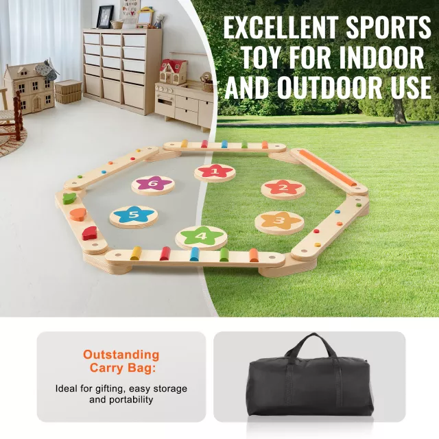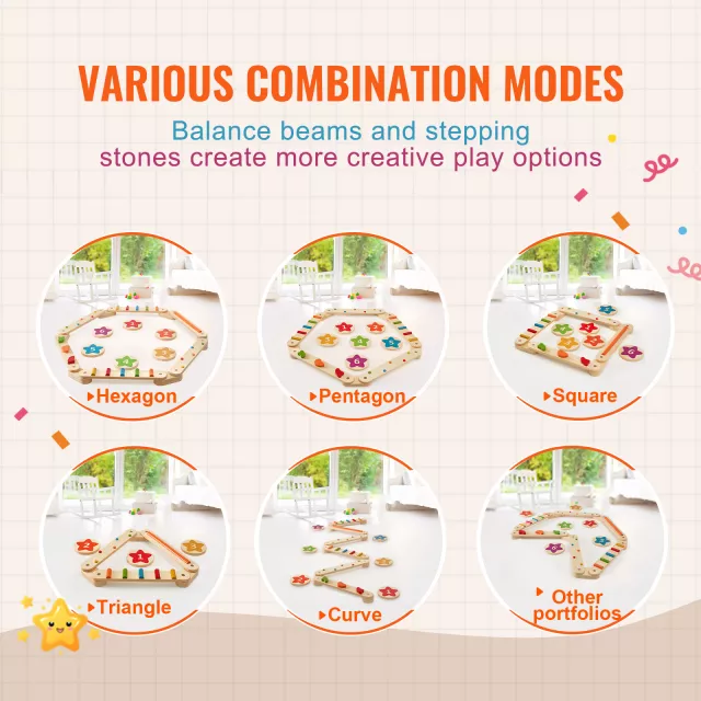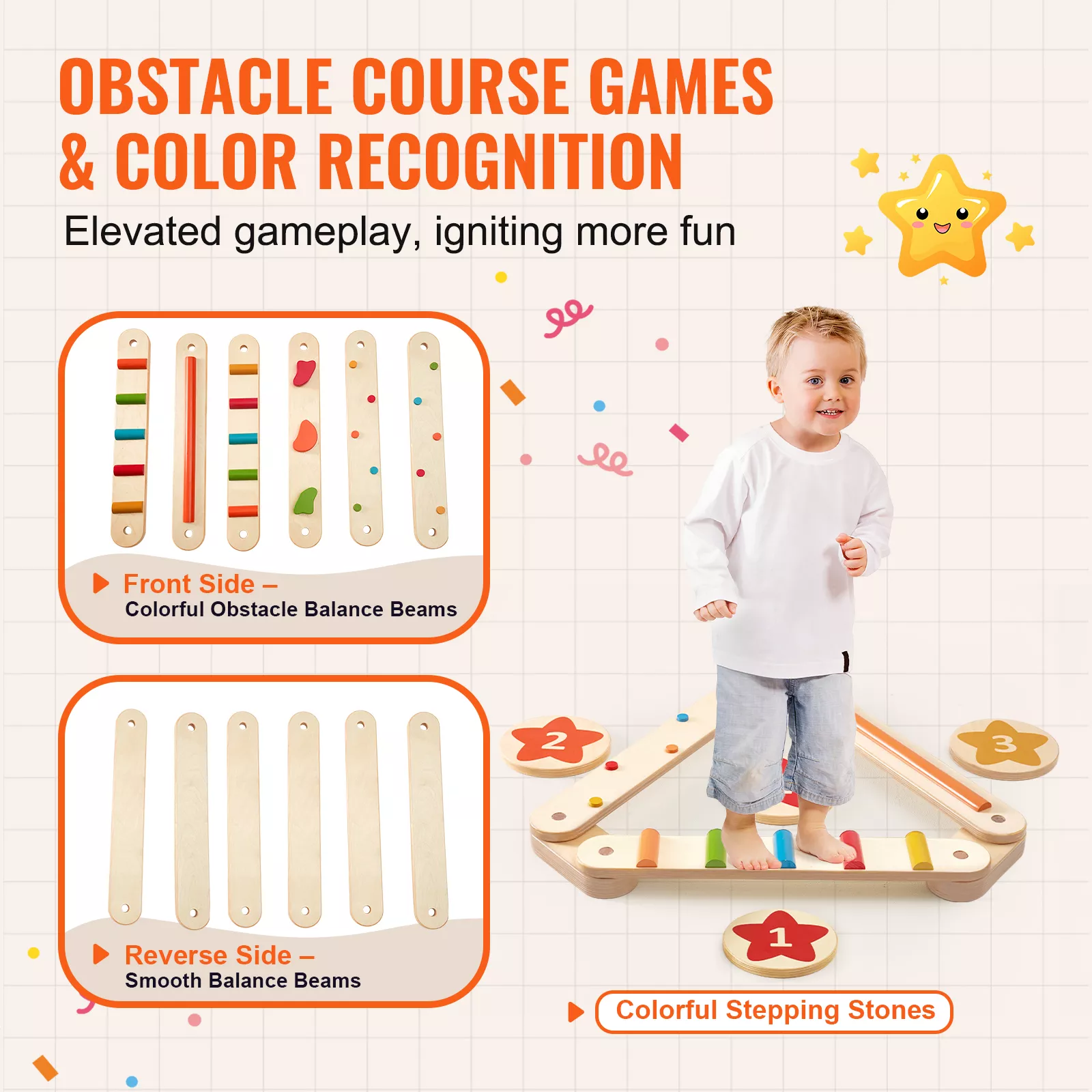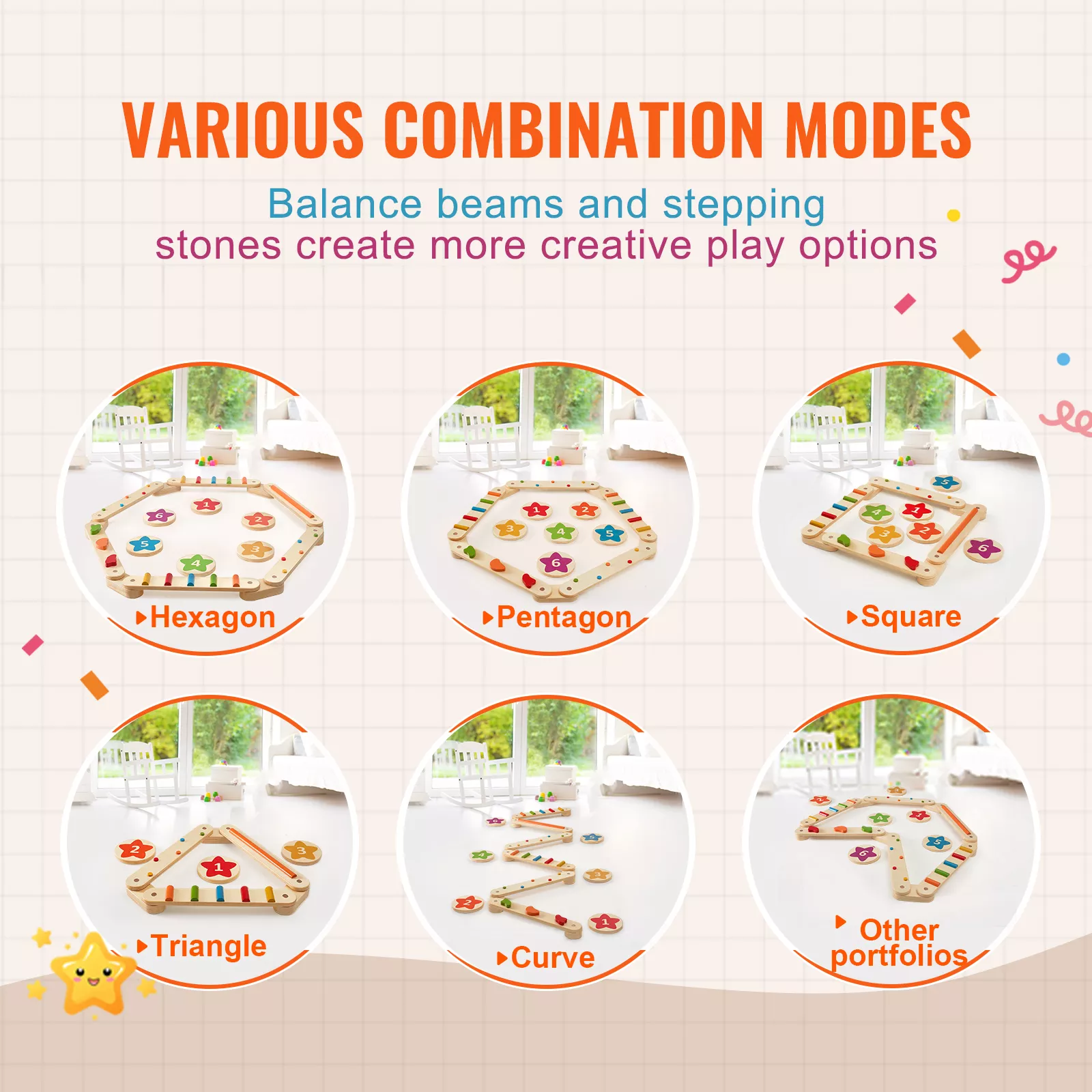 I was looking for something that would help my kids develop better coordination skills but also keep them entertained - this set does exactly that. It's not just about balancing on the wooden beams or hopping from one colorful stone to another, it's about problem-solving as they figure out how best to navigate the course they've made up themselves. Also appreciate how safe everything is with rounded edges and child-safe varnish.