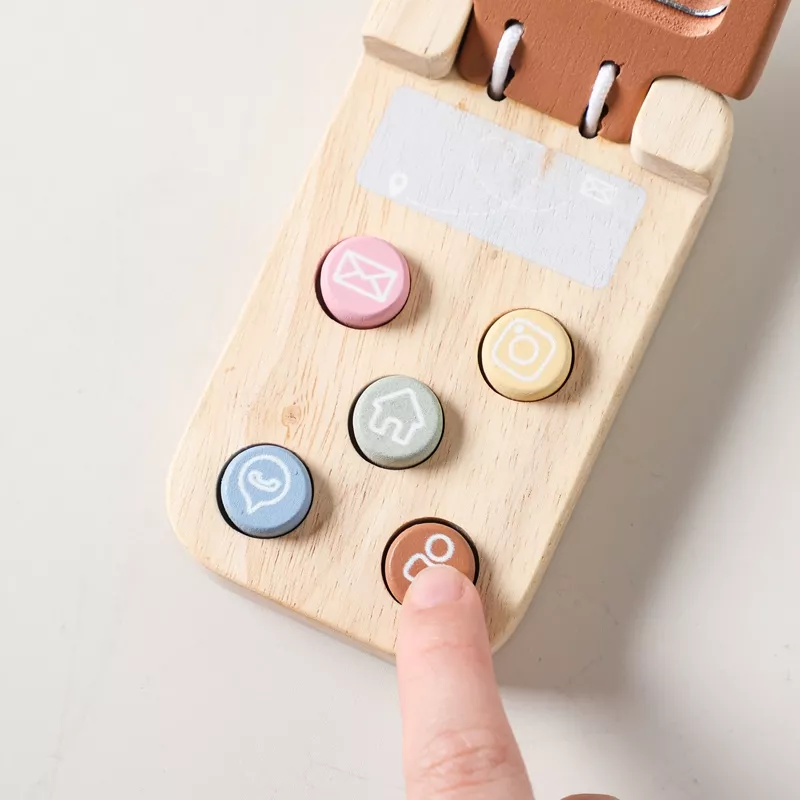 What an amazing product this is! A perfectly sized wooden toy phone that encourages imaginative play by pretending to have conversations on their own little device. Not only does it stimulate sensory development through touch, sight, and movement but also enhances fine motor skills through button pressing.